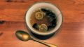 パフェグラスの底にパッションフルーツの中身を入れます